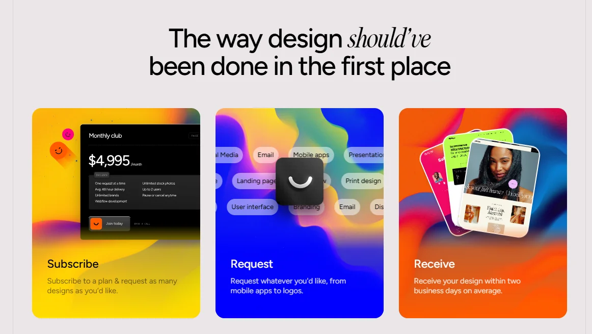 이 모델은 디자이너를 고용할 때 발생하는 모든 불편함을 제거합니다. 제안서도, 협상도, 회의도, 장기 계약도 없어요. 바쁜 창업자에게 이 '간결함' 자체가 상품인 셈입니다.