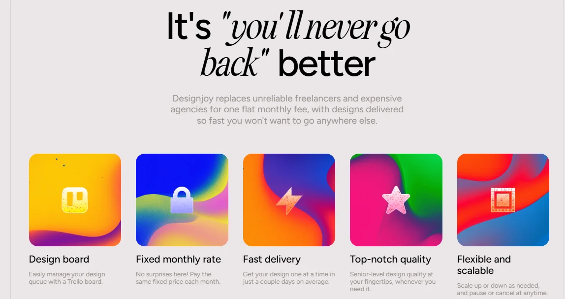 월 4,995달러(약 600만 원) 이상의 프리미엄 가격을 책정함으로써, 디자인조이를 값싼 프리랜서의 대안이 아닌, 연봉 1억 원 이상의 시니어 디자이너를 대체하는 합리적인 선택지로 포지셔닝했습니다.