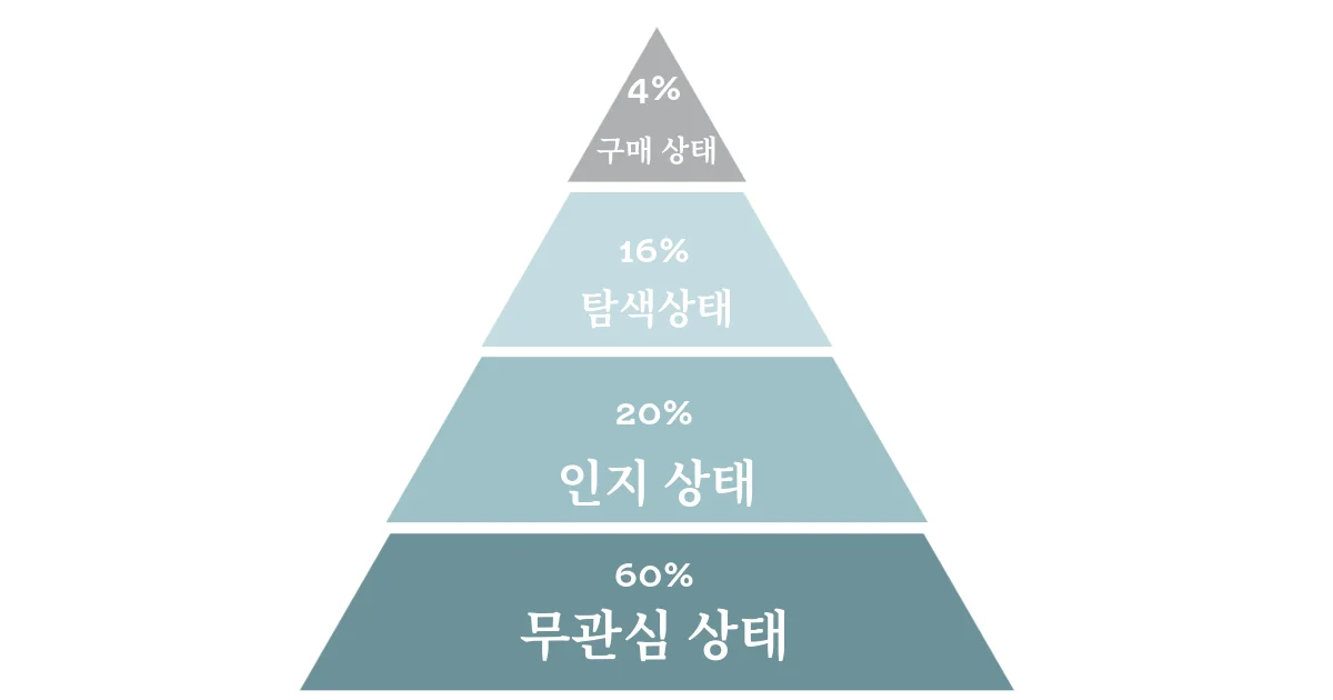 바로 인지 상태에 있는 20%와 무관심 상태의 60% 사람들을 대상으로 마케팅을 해야 합니다. 관심이 없는 사람들을 콘텐츠를 통해서 탐색 상태로 끌어올리고, 나아가 구매 상태로 전환 시켜 내 고객으로 만들어야 하는 것이죠.