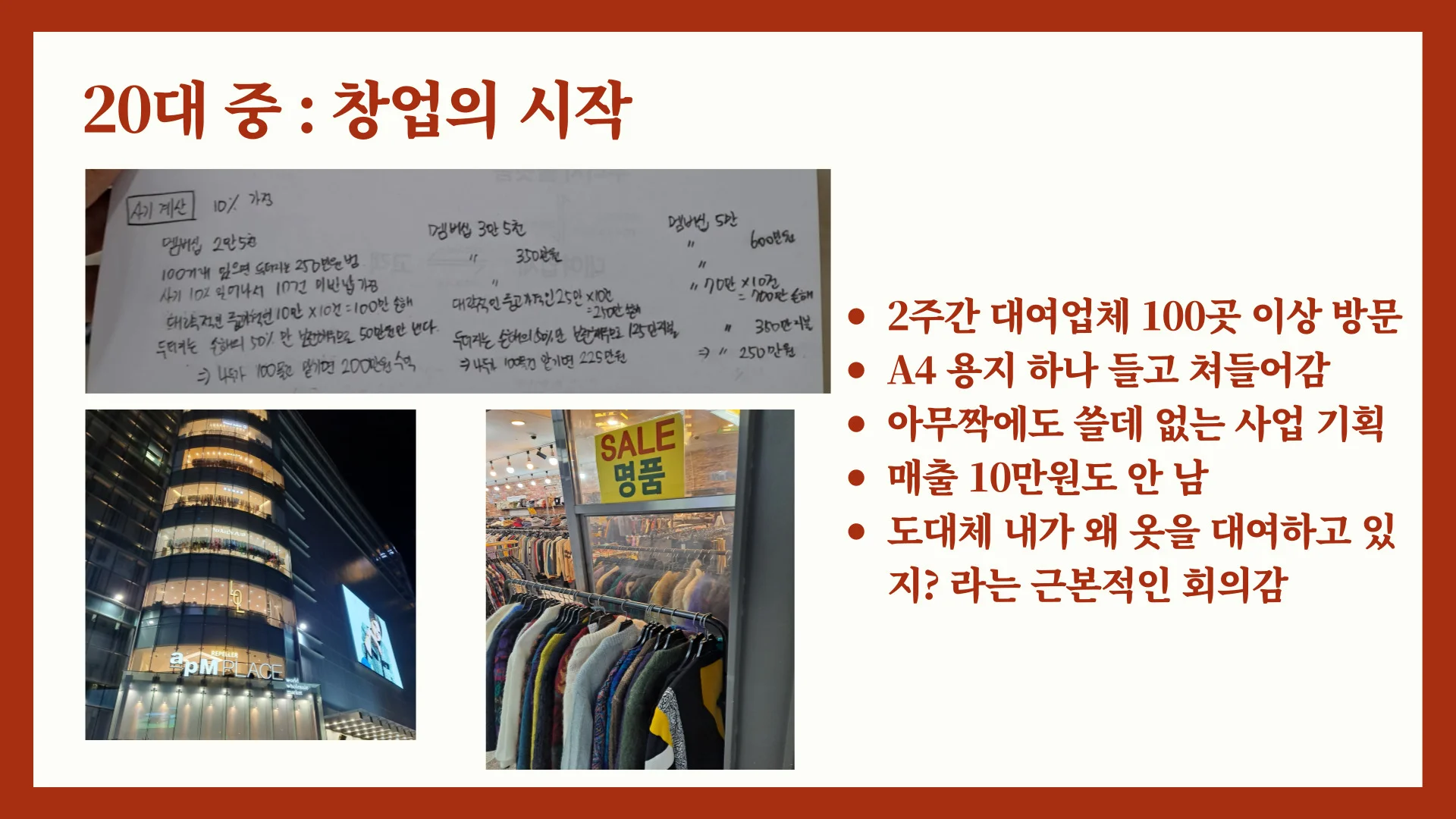 확실히 말씀드리겠습니다. 저희 사업은 “창의적”이지 않습니다. 그리고 저는 창의적이지 않기에 저희가 성공할 것이라고 믿습니다. 스타트업을 처음 시작했던 2021년도에, 저는 ‘남들이 안 하는 아이템’, ‘남들이 생각하지 못한 아이템’을 찾는 데에 혈안이 되어 있었습니다. 그래서 ‘B2B2C 구조를 띄는 공유 옷장’이라는 누구도 이해하지 못할 아이템에 9개월을 투자했습니다. 매출은 10만원도 나지 않았습니다.